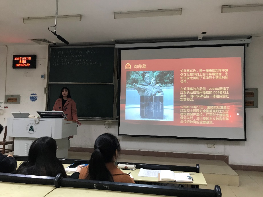胡青以“重走长征路,再读长征史”为主题,向党基班学员讲述了自己作为“省青马工程学员”的游历过程和种种领悟。毛主席四度赤水的英勇神武、邓萍墓革命烈士的惨烈牺牲、娄山关红军首次胜利的来之不易……一个个充满着画面感的事例铺垫着这条长征路,从中国工农红七军前委旧址到湘江战役,到红军堂,到界首渡口,到红军山革命烈士墓,到遵义会议,处处彰显了红军为命运、为国家、为人民誓死抗争的革命理想信念。期间,还播放了三段当地人重演战争历史的短话剧,给人以更加直观的感受。当谈及一位头发花白的红军后辈二十年如一日地讲述长征史时,现场一片唏嘘。