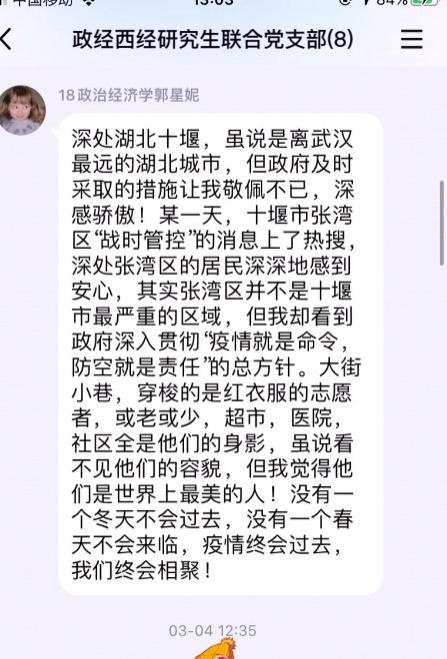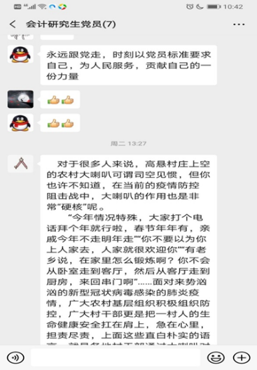 徐悦同志发自肺腑的说:在新冠肺炎疫情发生后,作为身在疫情中心的湖北人,我深感祖国的关爱与伟大。在以习近平同志为核心的中共党人与无数爱国人士的领导下,我国采取了切实有效的措施,坚决遏制了疫情蔓延。我相信在以习近平同志为核心的党中央的坚强领导下,在中国人民的团结奋战下,必能在此次攻艰防疫战中取得最终的伟大胜利。武汉必胜、湖北必胜、中国必胜!会计学研究生党支部的其他同学也纷纷发表了意见。