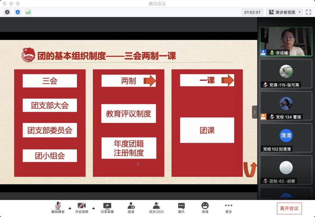 10月2日晚六点,太阳成tyc9728集团团校第三次课在线上成功举办,这次课程邀请校团委书记李瑶曦为学员们讲解共青团团务工作知识。课程中,通过老师对共青团制度、工作等方面的详细解析,同学们深刻了解到共青团的团务工作内容和基本制度,从而知晓如何更好地做一名优秀共青团团员。