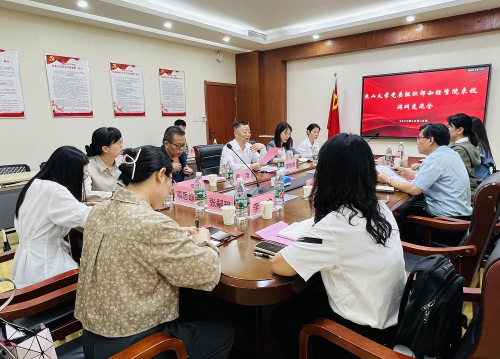 在调研会上,双方就学院党建顶层设计、工作体系,从“推动党建与事业发展“一融双高”的举措和经验”“聚焦增强基层党组织政治功能和组织功能,积极推动党建工作创新的制度和方法”“学生党建与思政教育深度融合的机制和载体,以及学生党员教育管理的做法和经验”三方面进行了深入交流。