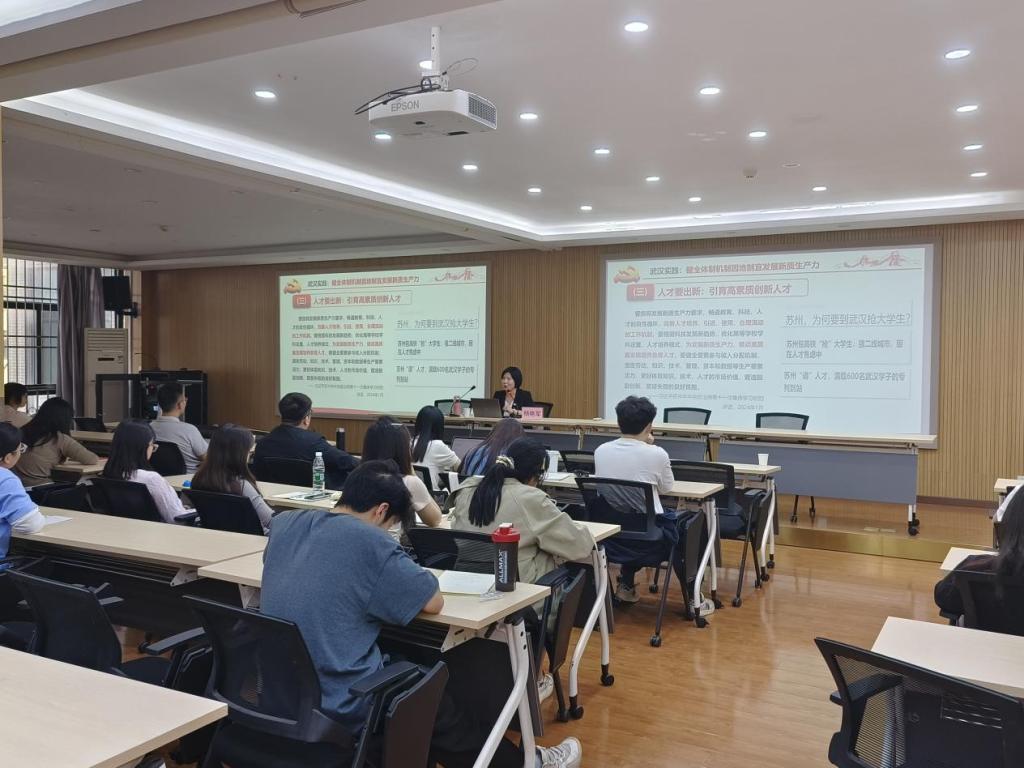 10月9日,学院于2014阶梯教室开展深入学习贯彻党的二十届三中全会精神专题党课。学院党支部书记、党员代表、第56期入党积极分子参加会议,院党委书记邵俊青出席并作开场致辞。中共武汉市委党校(武汉市行政学院)经济学与经济管理教研部副主任、副教授杨艳军受邀作为主讲人,以“因地制宜发展新质生产力,加快推动武汉经济高质量发展”为题,为全体与会人员上了一堂主题鲜明、内涵丰富的专题党课。