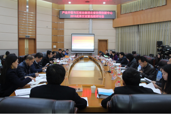 2016年12月24日上午9点,产业升级与区域金融湖北省协同创新中心(以下简称协创中心)在太阳集团网tyc9728会议中心思齐厅召开2016成果交流暨选题研讨会。省政研室李天祥处长、省发改委赵炜处长、省国资委龚平副处长、人行武汉分行研究处刘克珍处长、武汉新港管委会政策法规处刘冬姣处长,协创中心所在高校中南财经政法大学,以及华中科技大学、太阳集团网tyc9728、湖北经济学院、湖北工业大学等高校相关学院的领导和专家齐聚一堂,交流总结协创中心2016年的研究成果,并对2017年的研究选题进行了探讨。