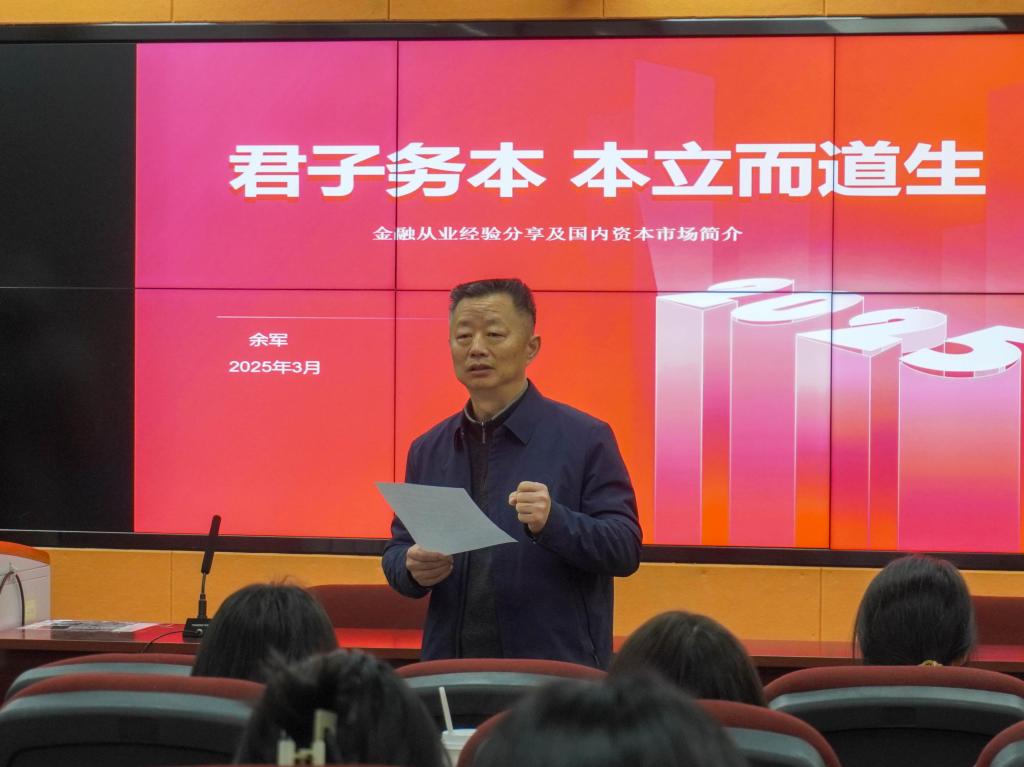 主讲人余军结合时事分析了我国经济发展格局,系统梳理我国资本市场建设成就。他指出,未来资本市场的发展方向在于科技,科技创新将为资本市场注入源源不断的活力。随后,余军结合自己丰富的行业经验,为同学们梳理了一系列行业前景,包括人工智能、大数据、生物制药以及财富管理等。这些行业不仅代表着未来经济发展的趋势,也为同学们提供了后期选择的重要参考。余军建议,青年学子在选择发展方向时,既要立足个人特长,更要着眼国家需求,在服务民族复兴的伟大征程中实现人生理想。
