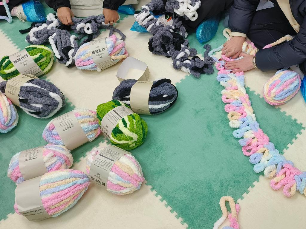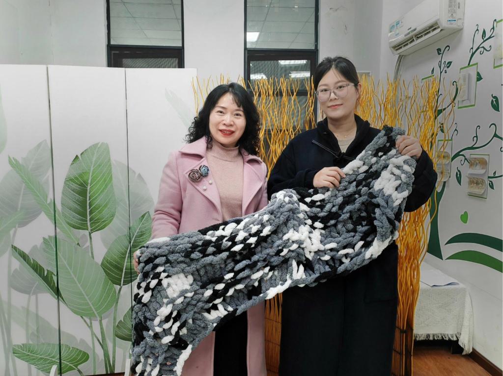12月11日,在太阳成tyc9728集团芯宠空间的活动现场,朋辈志愿者化身“小老师”,手把手教同学们编织毛毯。活动现场气氛热烈,同学们纷纷动手尝试,温馨的氛围弥漫在每一个角落。