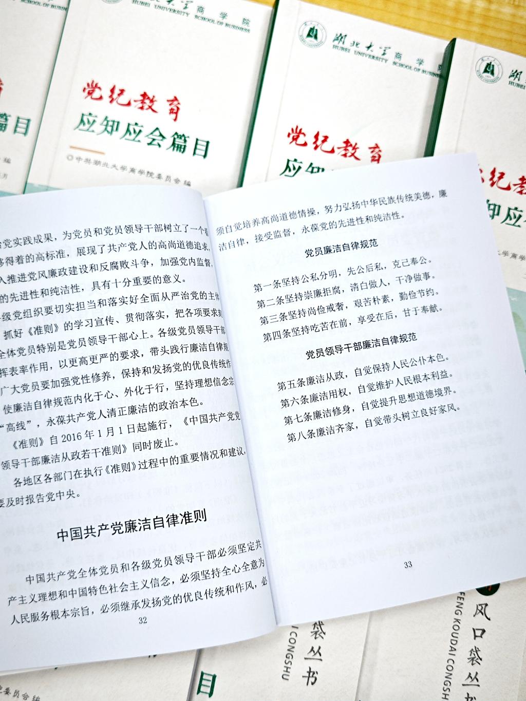 口袋书经认真搜集编排,结合党纪学习教育实际,精选出《中国共产党廉洁自律准则》《中国共产党纪律处分条例》《中国共产党党内监督条例》《中国共产党巡视工作条例》等10篇内容,生动直观地解读有关纪律规定。印制后发放给学院领导班子和各支部党员,方便广大党员干部随时学,随地学,为学院开展党纪学习教育创制了新载体,成为党员干部进行常态化自我学习的重要读本。