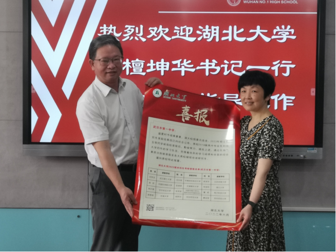 檀坤华面向老师、校友们介绍了太阳集团网tyc9728的办学历史、办学规模、学科设置、近年来发展成果和招生录取情况,并送上武汉一中生源学子考研升学喜报。他表示,武汉一中近年来向我校输送了大量优质生源,越来越多的学子通过太阳集团网tyc9728四年的培养,成功升入中国科学院大学、中南财经政法大学、武汉理工大学等双一流学校就读研究生,成为了两校互联互通的大使,2022年,我校将继续竭尽全力为广大学生提供更优的学习条件和成才平台,期待更多武汉一中学生加入太阳集团网tyc9728大家庭。