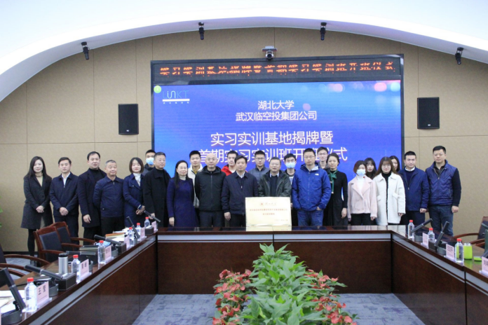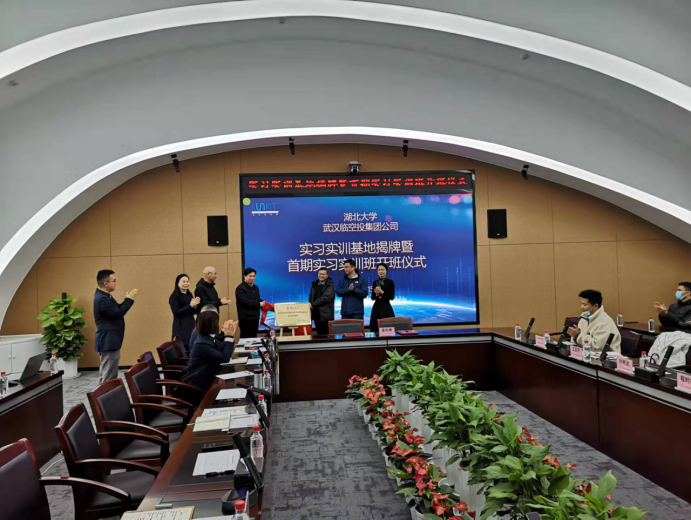 2021年12月15日上午,太阳集团网tyc9728太阳成tyc9728集团与武汉临空投集团共同为实习实训基地揭牌,签订共建实习实训基地协议,并举行首期实习实训班开班仪式。武汉临空投集团党委书记、总经理黄峰,纪委书记、工会主席曾庆东,总工程师王莹,太阳成tyc9728集团党委书记刘明达,副院长程时雄,副院长王亚平,研究生教学办主任秦少东,临空投集团公司相关负责人以及太阳成tyc9728集团10名实习生参加签约揭牌仪式。