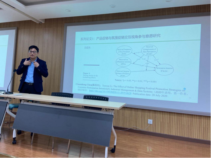 疫情之下,湖北人才发展战略与政策研究中心组织举办多场学术讲座。2020年10月28日下午,中心邀请中南民族大学管理学院陈传红副教授作为主讲嘉宾,为太阳成tyc9728集团师生带来题为《数字经济与消费行为研究系列论文写作与发表体会》的学术讲座。陈传红老师于2013年在华中科技大学获得管理学博士学位,现为中南民族大学管理学院电子商务系副教授;他还是美国加利福利亚大学伯克利分校访问学者,湖北省电子商务学会理事,湖北省系统工程学会理事,《Asia Pacific Journal of Marketing and Logistics》(SSCI)和《管理学报》审稿专家。他的研究方向是数字经济与消费行为、共享经济与协同消费、大数据与电子商务战略。近年来,主持了国家社科课题1项,教育部课题2项,其他省部级课题5项,发表高水平论文十余篇,其中近两年发表SSCI论文2篇、国家自然科学基金委认定管理学重要期刊论文2篇。