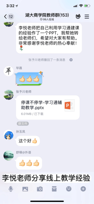 一是及时组建以青年教师和网络教学经验丰富的教师为主体的技术支持团队,形成立体式指导服务体系,及时解答相关问题,有效帮助师生开展线上教学。开学初期,团队在学院教师群里及时答疑并积极分享网络教学经验。李悦老师总结自己长期以来的线上教学的经验,制作成PPT分享给大家,PPT里对线上教学的核心、教学流程的设计、线上师生互动等方面进行详细的说明,并配上细致的操作流程。同时青年教师提前学习各平台的操作方法,再一对一的指导上手操作慢的老师,细致耐心的帮助与辅导让教师们快速掌握操作流程,有效提高了教学效果,同时也为后期实现信息技术和教育教学深度融合奠定了良好基础。