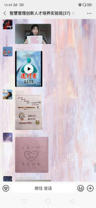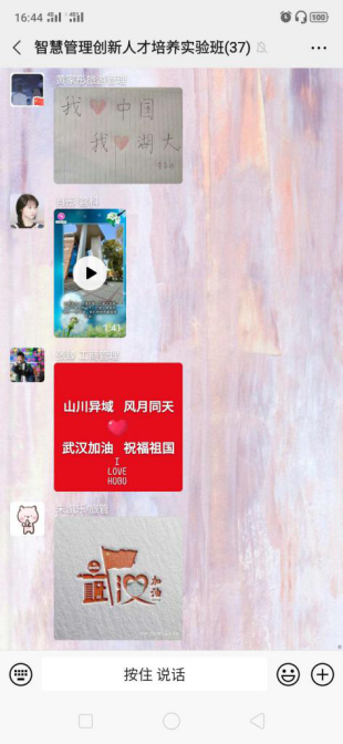班会最后,同学们在微信群里接力表白,祝福祖国,祝福武汉,祝福学校。