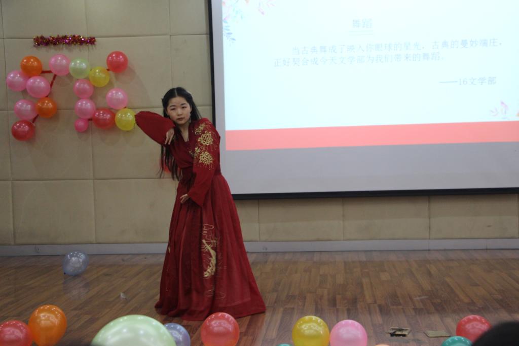 下午两点,商院青传举办的2018元旦晚会在数统学院拉开帷幕,2016级危林峰、高子雯、易子卫、古玥担任主持人,每一个部门都精心准备了节目。晚会开场,第十届主编郝邵法、石志奇致新年贺词,因参加研究生考试而未能到场的“老主编”宋玫莹、刘国威发来祝福视频,表达了他们的新年祝福以及对后几届商院青传成员的期望。开场节目是2017级宣传部带来的《魔术与魔方速拧》和尤克里里弹唱表演,单手拧魔方的那位同学的速度让大家目不转睛,还为大家演奏了尤克里里。魔术表演的同学邀请观众协助,且其表演通过幽默诙谐的互动引得观众笑声连连并活跃了现场的气氛。2016级文学部高子雯身着一袭红衣表演古典舞《礼仪之邦》美轮美奂。晚会尾声,2016级秘书部带来的小品《武林外传》把古代影视角色和现代综艺节目的形式结合起来,并利用男女反串角色的方式让该节目更具吸引力,赢得了观众热烈的掌声,将全场的气氛推向高潮,最后,晚会在2017级记者部《当你》的歌声中收尾。