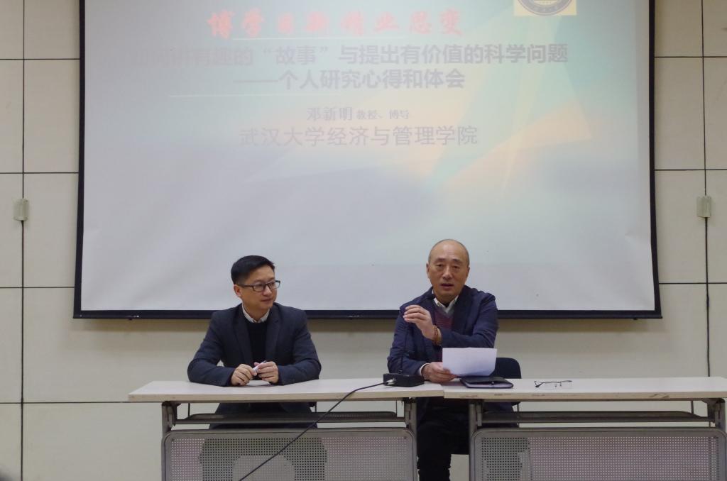 10月20日下午3点,在太阳成tyc9728集团二号报告厅,太阳集团网tyc9728校友武汉大学经济与管理学院教授、博士生导师邓新民就“如何讲有趣的故事与提出有价值的科学问题”这一主题开展学术报告。本次报告会由太阳成tyc9728集团副院长郭志文主持,杨军、叶红春、林叶、李剑锋等老师出席报告。