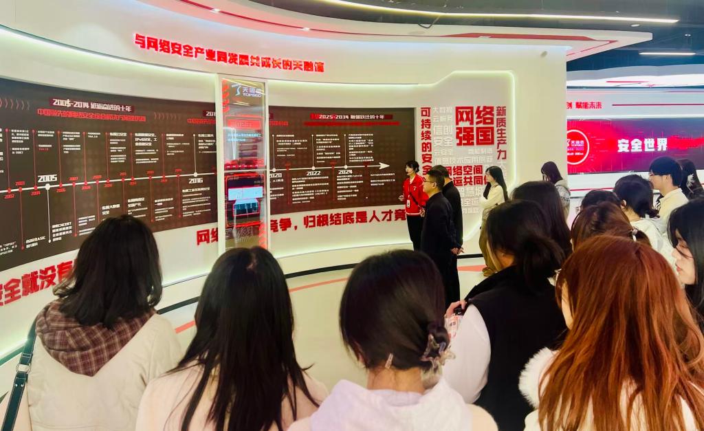 随后,师生们走进天融信武汉总部。大家一起参观了公司展厅,工作人员为大家系统介绍了天融信在网络安全领域的发展历程以及下一代可信网络安全架构、国产大飞机防火墙应用等前沿技术产品。通过深度参访,同学们深刻体会到数字经济背景下网络安全与数据主权对于国家现代化建设的重要性。