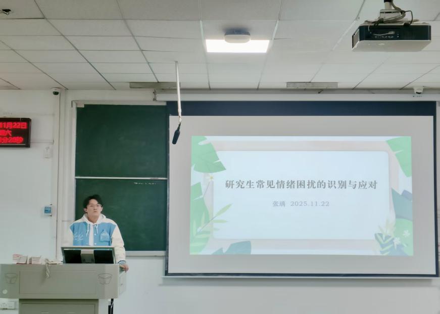 为切实关注研究生群体心理健康状态,帮助学子有效识别并应对科研与生活中的情绪困扰,11月22日,学院特邀艺术与设计学院辅导员张瑀老师,开展以“研究生常见情绪困扰的识别与应对”为主题的心理健康专题讲座。各专业研究生齐聚现场,共同开启一场关于心灵呵护的学习之旅。
