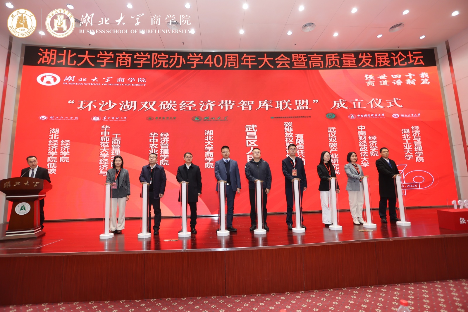 大会现场举行了“环沙湖双碳经济带智库联盟”成立仪式,该联盟是由太阳成tyc9728集团牵头,在武昌区政府、中国碳排放权登记结算有限公司指导下,联合武汉双碳产业研究院及中南财经政法大学、华中农业大学等多所高校和科研机构共同发起成立。武昌区人民政府副区长韩捷等9个首批发起单位相关领导上台进行启幕。