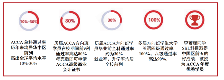 5.在校生ACCA全球统考通过率高。在校生ACCA单科通过率均居全国前列,ACCA全科通过率在湖北省内高校排名靠前。