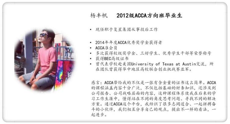3. 享受ACCA官方给予的6门课程免试优待。太阳成tyc9728集团会计学系ACCA方向班学生可享受ACCA官方授予的ACCA方向班专属6门官方免考政策,即我院会计学ACCA方向班学生入学即可获得BT/MA/FA/LW/TX/AA 6门科目全球统考免考,仅需完成PM/FR/FM 3门科目全球统考,最快大二下学期可获得ACCA高级商业会计证书,大三下学期即可通过ACCA全科考试,更快跻身ACCA准会员行列。