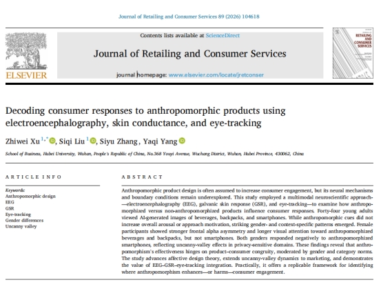 近日,我院许志炜副教授及其团队在《Journal of Retailing and Consumer Services》发表题为《Decoding Consumer Responses to Anthropomorphic Products Using Electroencephalography, Skin Conductance, and Eye-Tracking》的高水平研究论文。该论文由我院许志炜副教授与其指导的硕士研究生刘思琪共同担任第一作者。