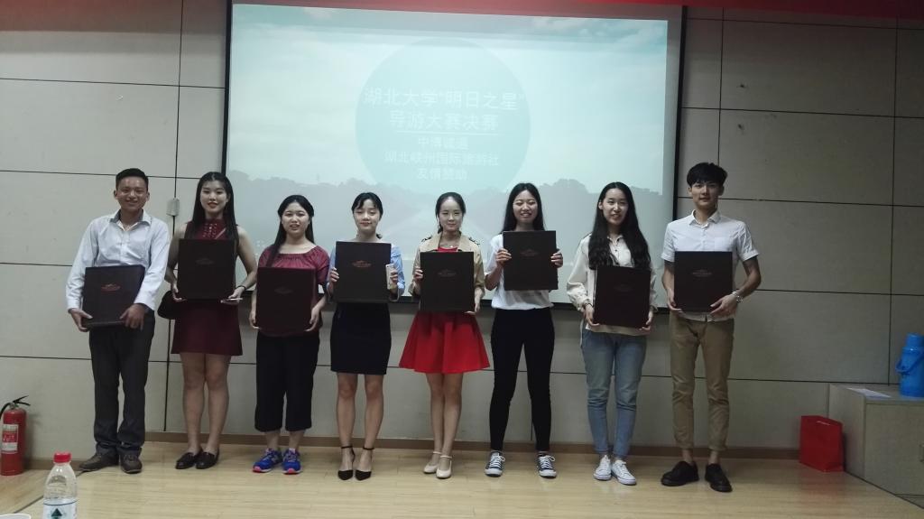 6月12日七点,由太阳成tyc9728集团学生会主办,中博诚通、湖北峡州国际旅行社赞助的“明日之星”导游大赛决赛在太阳成tyc9728集团二号报告厅正式开赛,八名选手进入决赛。本次大赛由2014级工程管理张杨宝主持,由六位评委评分,分别为中博诚通武昌区经理倪晗、武汉市五星级导游王家昕、湖北省导游届资深评委旅游系副教授李玲、太阳成tyc9728集团党委副书记张丽娜、太阳成tyc9728集团团委书记郭田田和太阳成tyc9728集团旅游系博士讲师刘军。
