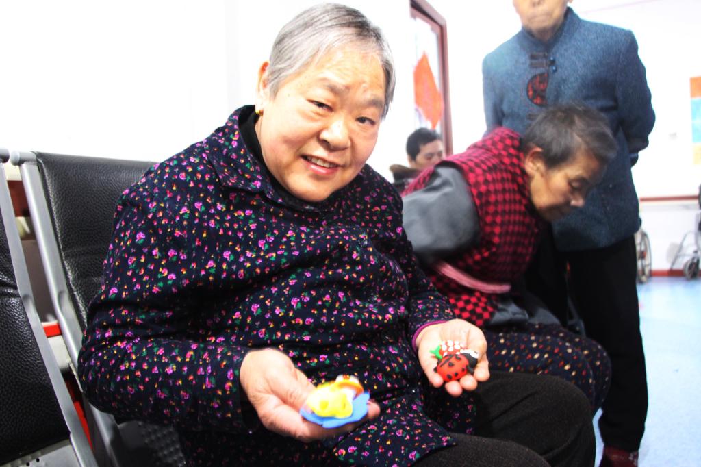 护理人员告诉志愿者们有一位吴爷爷卧病在床,在听说有人来看望老人们的时候他很开心,非常希望志愿者们能与他说说话。于是在护理人员的带领下,部分志愿者来到了吴爷爷所在的房间问候他。吴爷爷在看到志愿者们时眼角泛起了泪花,嘴里一直念着“谢谢你们”,没有过多的言语。活动最后,志愿者们为老人们送去了自己亲手制作的泥偶,向他们道别,与他们合影,老人们希望志愿者们能够多开展类似的活动。11时许,志愿者们与院长合影留念后便返回了学校。