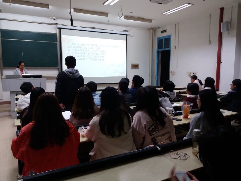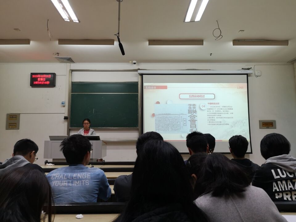 活动以共青团团歌开场,围绕五四运动的主要经过、什么是五四精神、五四运动的历史特点、如何弘扬五四精神、如何做新时代有为青年、五四运动知识问答六个方面展开。主讲人通过图文介绍,让同学们了解了从北京学生运动到上海工人罢工、文界相应,最后中国收回主权的五四运动全过程。五四运动历经三年,几经波折,在全国人民的极力推动下才收回主权,其过程的艰辛让同学们感受到了现在中国领土和地位的来之不易。而后主讲人强调了五四运动精神的核心内容,并以此引出了五四运动的历史意义。关于如何弘扬五四精神,做有为青年,主讲人强调五四精神表达的是一种“作为一个中国人,无论何种阶层,从事何种职业,在民族需要的时候,都可以为国家奔走效力”的爱国精神,尽管在不一样的历史背景下有不一样的表现形式,但爱国的核心是一模一样的。活动以答题环节结尾,同学们都积极踊跃地参与,加深了对五四运动的了解。