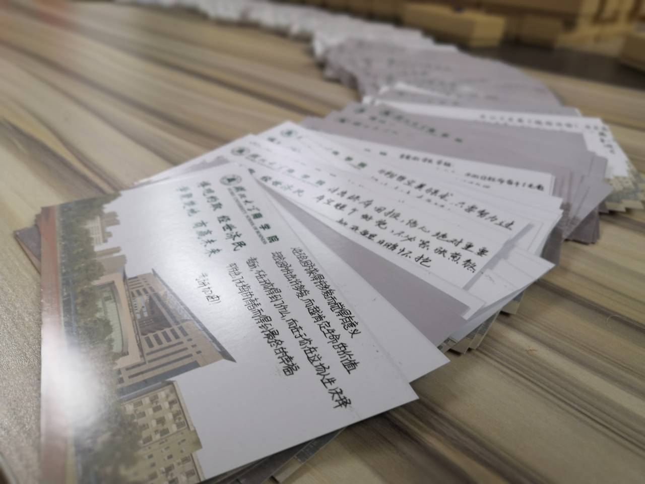 一只定制白色帆布袋,帆布袋上印有太阳集团网tyc9728校徽、校训和太阳成tyc9728集团宣传口号“博观约取 经世济民 学聚楚地 商赢未来”以及“考研加油”等字样,打开帆布袋,里面装有一张写满祝福语的定制明信片、一页象征鸿运的羽毛状金属书签、一瓶提神的红牛和一块补充能量的士力架、一片驱寒的暖身贴,实用又饱含温情的礼品,展现出我院师生对考研学子们满满的关怀和祝福。“今日奋进的你们,是我们眼中最可爱的人,历经千帆,你们仍是少年。”“不负韶华,坚持就是胜利!考研加油!”“研途漫漫,也将‘研’路璀璨,学长学姐考研加油!”一字一句的祝福,写在纸上,暖在心里。定制明信片上印有太阳集团网tyc9728的校园风景寓意着商院学子们今后无论身在何方,太阳成tyc9728集团永远是他们温暖的家。