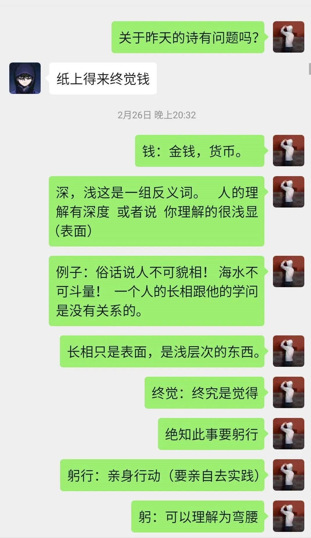 “古人学问无遗力,少壮功夫老始成”,他抛开了下句“纸上得来终觉浅,绝知此事要躬行”,初背之时独独喜欢上句,他认为这是“少壮不努力,老大徒伤悲”的翻版,我便解释这二者的差别。课后我细细回想,他喜欢上句的理由,唯有真正理解了才有喜爱之谈,他自身正处于年少求学艰辛之旅,他正是在躬行“少壮不努力,老大徒伤悲”的真理,渐渐的嘴角上扬了,他给了我看待问题的新思路……