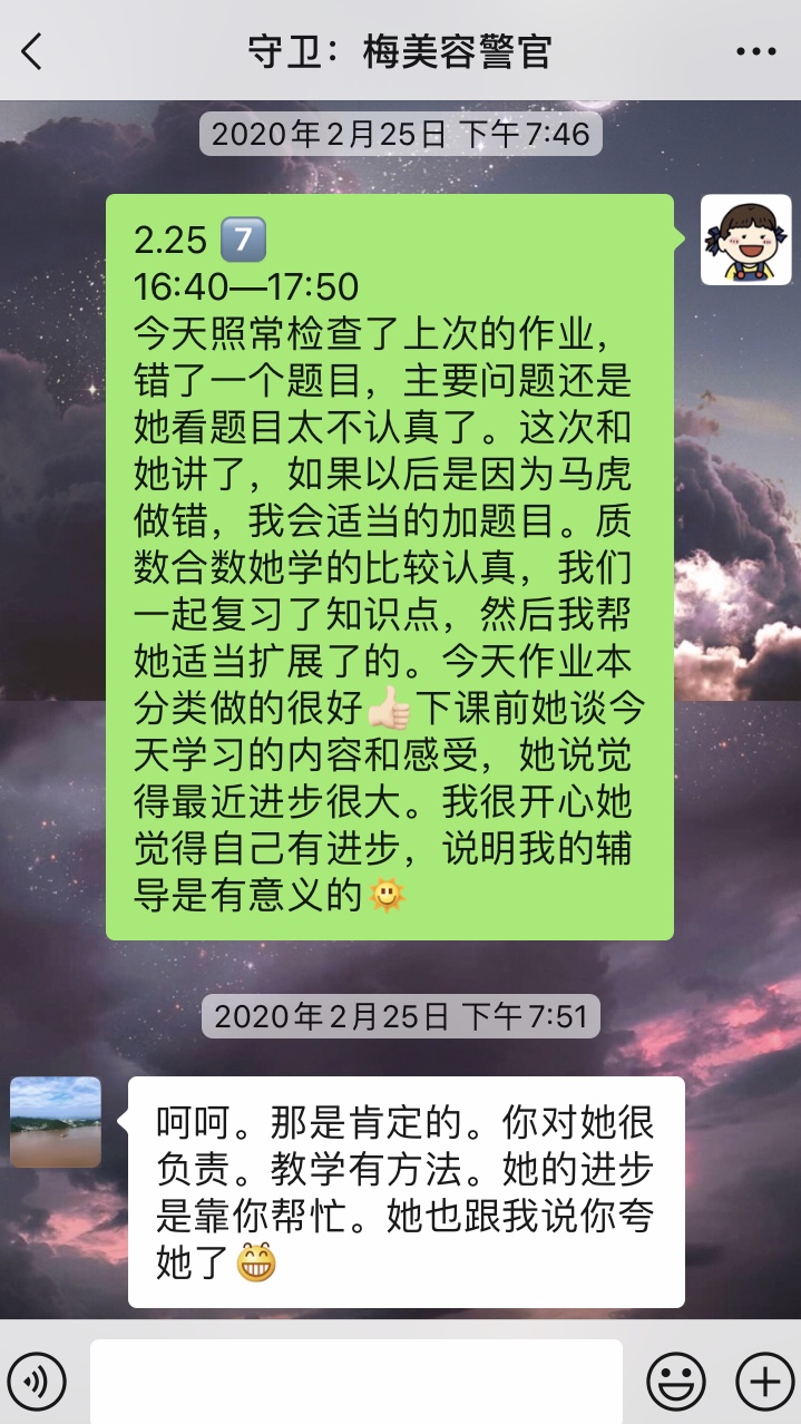 我对接的小队员是五年级的小雨嫣。2020年2月14日,拿到对接信息后,我和雨嫣妈妈第一次联系。当天已经比较晚了,所以我们约好第二天中午详细地聊一聊。简单的交流后,我了解到雨嫣的数学基础比较薄弱,注意力容易不集中。所以我初步制定了一个补课计划,把我和雨嫣的课表结合在一起。之后我加了雨嫣的微信,第一次的聊天很轻松,她告诉我她很喜欢画画,还和我分享了她的作品。我记得那天在下大雪,我们俩还给对方发送了下雪的视频。聊天结束后我们约好周日晚上视频通话,一起讨论她的周末作业。